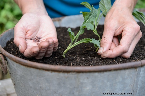 Plant two or three kale plug plants direct into the compost about 15cm apart in the centre of the pot.
