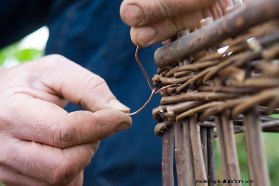 Use thin galvanised, plastic-coated or copper wire to secure the corners of the willow edging. Push the end of the wire through the woven end and thread it back three of four times. Twist the ends of the wire together and cut off the excess with wire cutters.