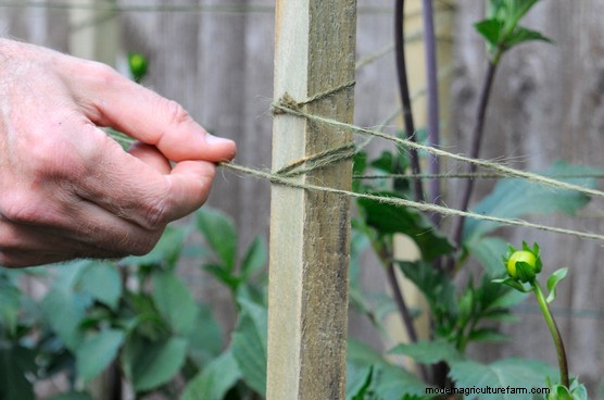 Weave garden twine back and forth between the stakes, running it at different heights to hold the stems.
