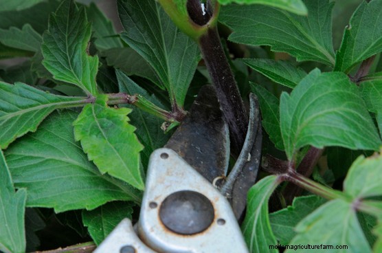 Once the plants are 30-50cm tall, cut out the tips of the main stems, to encourage side shoots to form.