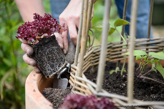 Add lettuce plug plants around the base of the wigwam, leaving 15cm gaps for the spinach. They’re great value for money.