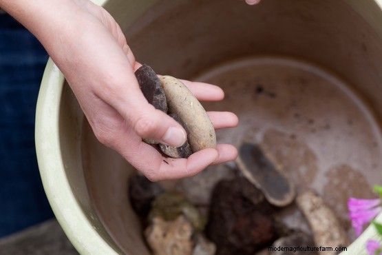 Thoroughly soak the roots of the plants to be repotted by placing it in a bucket of water. Cover the drainage holes at the base of the new container with pieces of broken clay pot. Add a 2cm – 3cm layer of pebbles or gravel to the base of the pot to allow for good drainage.