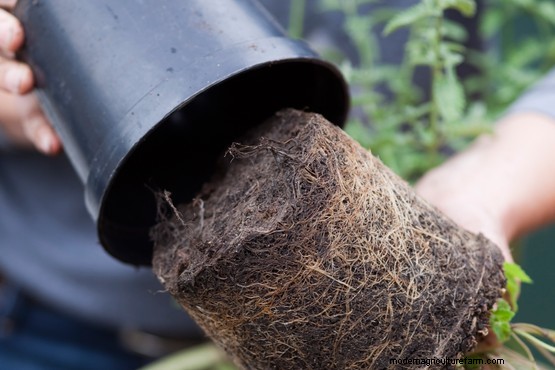 Knock the plant from its pot and gently tease the roots apart to encourage them to root into the fresh compost. Use your fingers to lightly firm the compost in the base of the new pot and set the plant in position.
