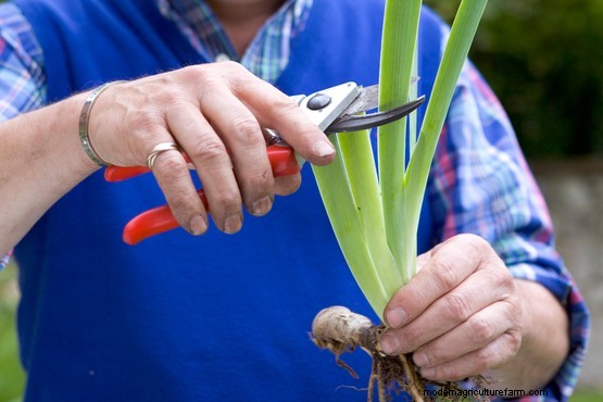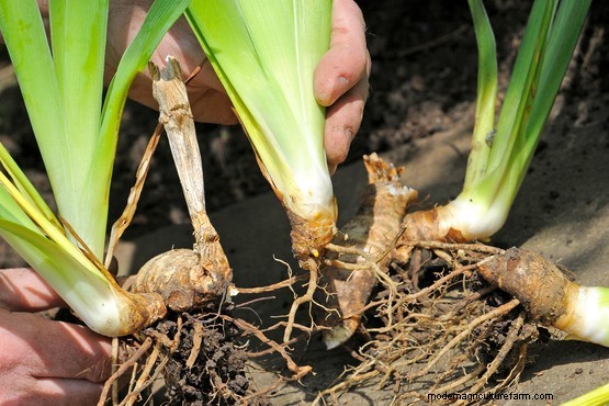 Newly-planted rhizomes are vulnerable to wind rock, so it’s a good idea to reduce the leaves by half. Use a sharp knife to trim them.