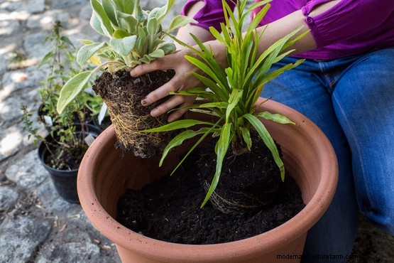 Choose a pot at least 50cm in diameter and fill the pot two-thirds full with compost. Remove the plants from their pots and tease out the roots if tightly congested.