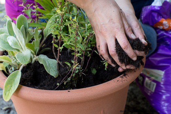 Arrange the plants evenly in the pot, with the tallest at the back. Fill in around the rootballs with compost, then firm down gently to a few centimetres below the rim.