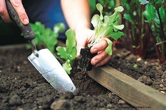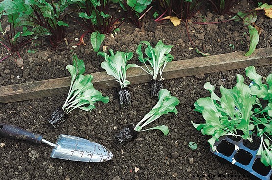 Plant lettuce with a trowel ensuring that the top of the rootball is at the same level as the surrounding soil. Fill soil around the roots and firm it in position using the tips of your fingers.