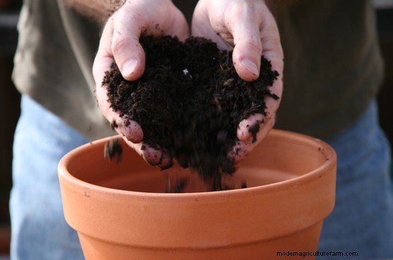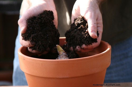 Place a layer of drainage material in the base of a large, deep pot, followed by a few handfuls of potting compost.