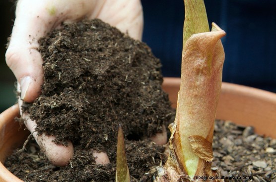 Sit the tuber in the pot and fill in around it with more compost, until just the new shoot is poking through the surface.