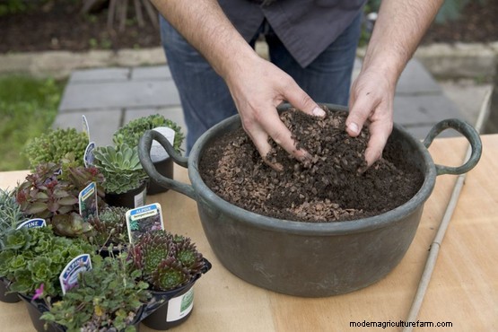 Fill the pot two-thirds full with compost and mix thoroughly with the horticultural grit.