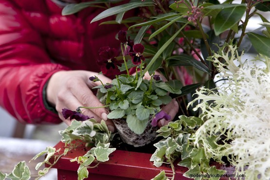 Plant up the window box, placing the taller plants at the back. Plant the ivies at the front of the box, ensuring they trail over the sides. Water the box thoroughly and allow to drain.
