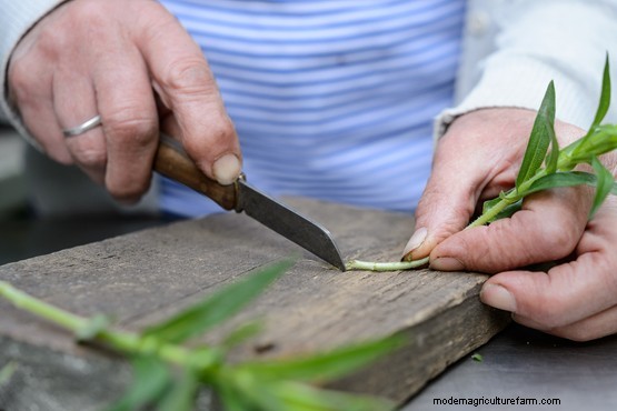 Take non-flowering shoots only, and make sure they’re healthy and pest free. Take more than you need. Strip the lower leaves using a knife or fingernails.