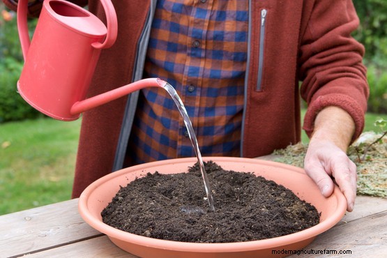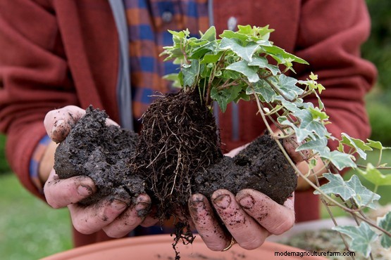 As you mix, keep adding water until it is the consistency of wet cake mix. Take the plant out of its pot and gently remove the compost around its roots with your fingers.