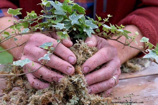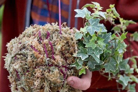 We used a young pot-grown ivy (Hedera helix) to make our kokedama, but you could also try violas, gaultheria, Helleborus niger or cyclamens for outdoor kokedama.