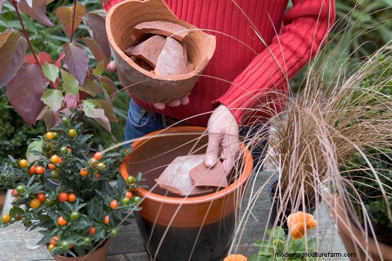 Place a layer of crocks or broken polystyrene on the bottom of your pot to ensure good drainage.