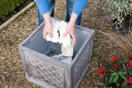 Place the pot in its final sheltered position then add polystyrene or crocks to improve drainage.