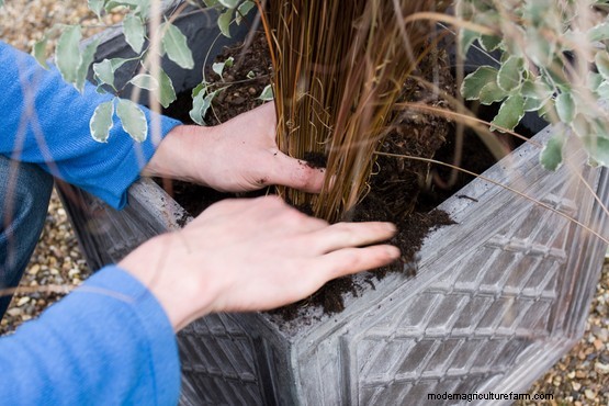 Tease out the roots of the carex, skimmia and ivy, and plant them around the pittosporum. Carefully fill any air pockets around the plants with compost and firm down well.