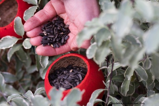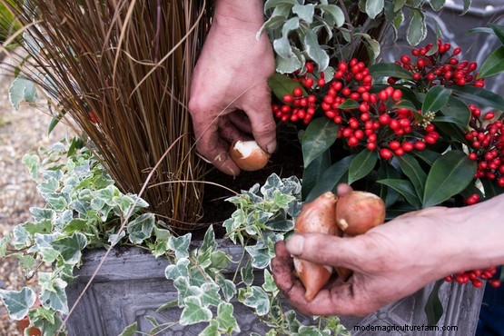 The addition of the bird feeders adds wildlife value to the pot display. Choose bright red feeders, to match the colour of the tulips and skimmia berries, or opt for a different, contrasting colour. Keep feeders topped up in winter to ensure birds don’t waste energy travelling to them.