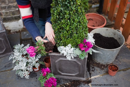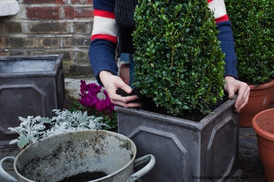 Plant the box cones in the centre of the pots and carefully fill around the edges with more compost.