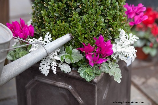 Plant a senecio on each side of the pots, along with a cyclamen on each corner. Fill any gaps with more compost.