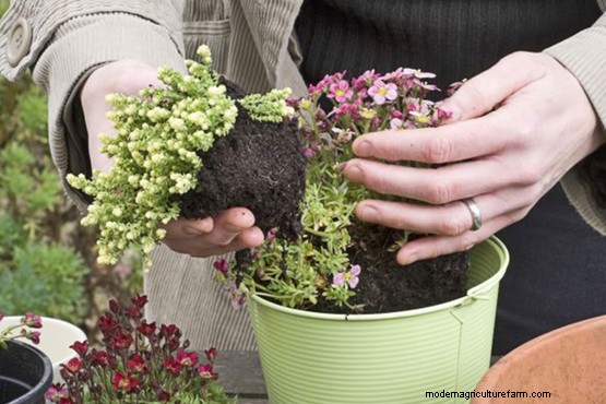 Use a kitchen knife to divide larger plants like the saxifrage. This allows for more combinations in one pot.