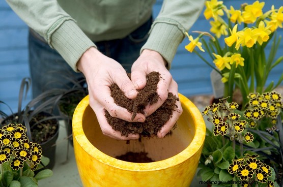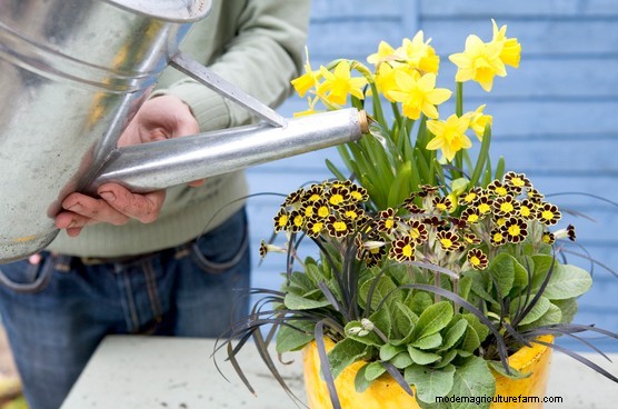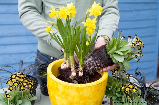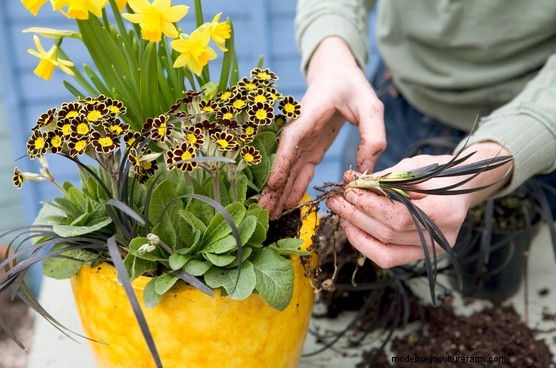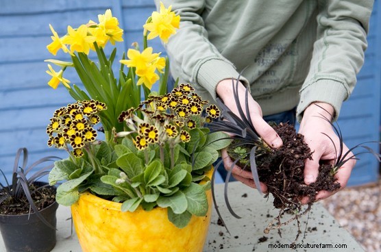 Poke the smaller pieces of ophiopogon between the primulas and narcissi. Fill in with more compost.