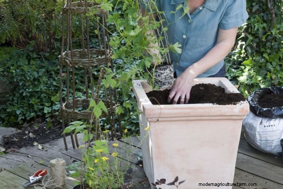 Make a hole in the centre of the compost, remove climbers from their pots and plant 15cm apart. Firm the compost around the climbers, making sure there are no air pockets around the rootballs.