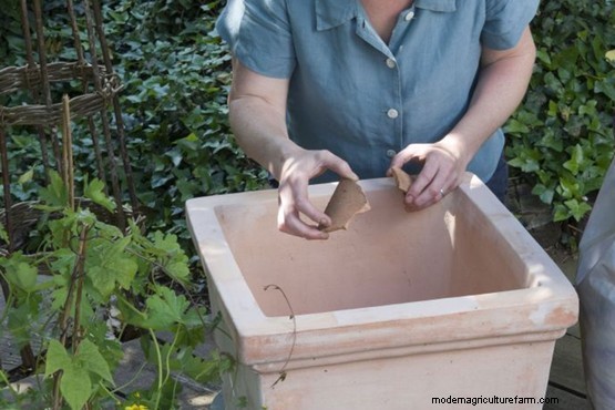 Plant up pots in position as they’ll be heavy to move later. Put a few bits of broken pot over the drainage hole to stop compost washing away while allowing excess water to drain.