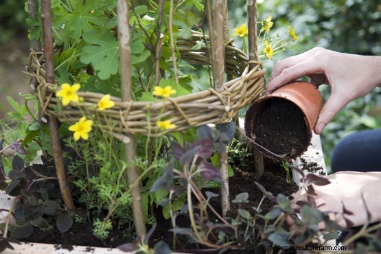 Place the willow support carefully over the top of the climbers. Push the legs firmly into the compost, ensuring the structure is even by checking the support’s bands are horizontal.