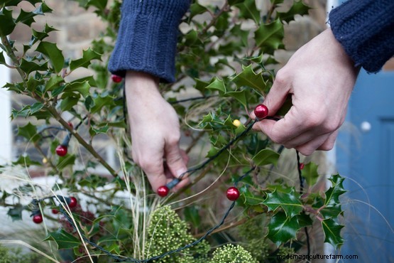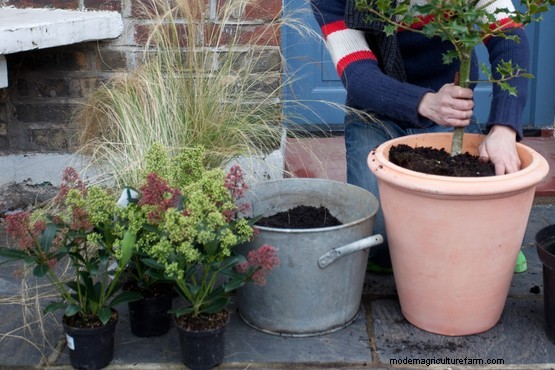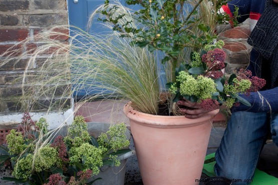 Position the holly in the centre of the pot, making sure it is straight, and add more compost.