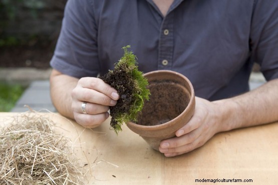 Take a clay pot and pop a small clump of moss from your garden over the drainage hole.
