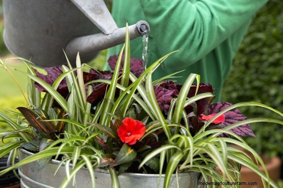 Plant the begonia first, at the back of the container, then the spider plants in front of it. Squeeze the busy Lizzie plants in whereever there is space. Cover with more compost and firm in well.