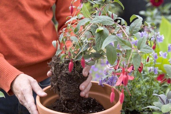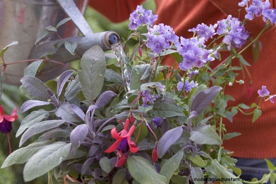 Plant the fuchsia first, in the centre of the pot, with the sage and nemesia plants around it. Firm plants in well and add more compost if necessary.