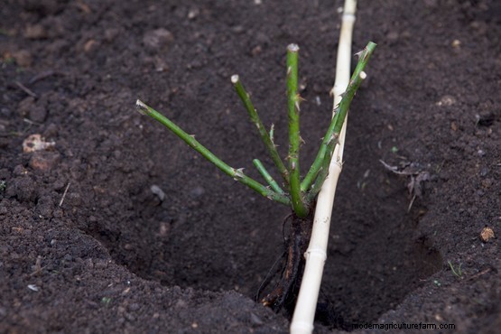 Set the bare-root rose in position and use a bamboo cane placed across the top of the hole to judge the final soil level around the plant. Aim to set the base of the stems just slightly below this level.