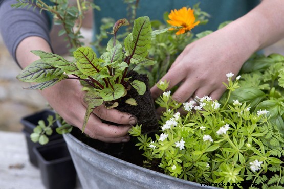 Most herbs originate in hot, dry climates and dislike our cold, wet winters. Growing them in pots is therefore perfect because they can be brought under cover for the winter. You can also keep them near your kitchen, where you can access them easily. Herbs look fantastic in containers, too – here we’ve combined red-veined sorrel with geranium, basil, calendula and salad burnet.