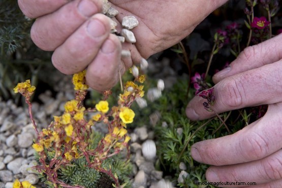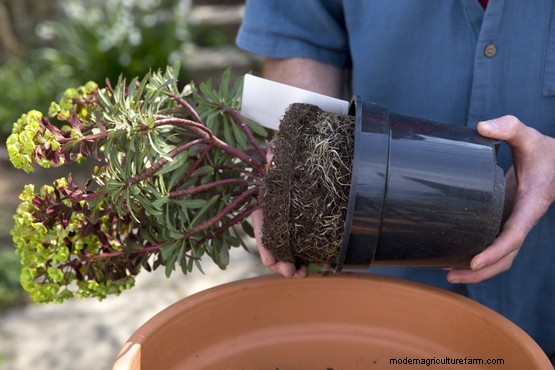 Plant the euphorbia and fennel plants towards the back of the pot, then plant the saxifrages and ajuga at the front. Space plants well so they have room to grow.