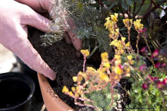Top up the pot with compost, firming it around the plants with your fingers.