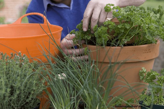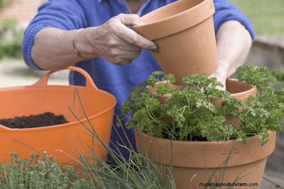Plant parsley all the way around the edge of the larger pot. You may need to squash the rootballs slightly to get them in. Fill any spaces with compost.
