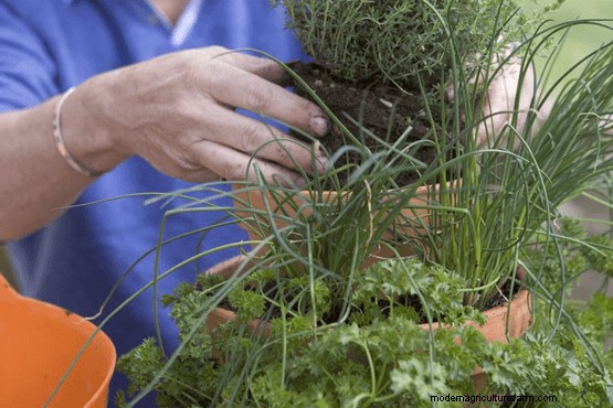 Half fill the second pot with compost and sit the third one in the centre. Plant chives all round the edge of the second pot, splitting the rootballs so they fit the space.
