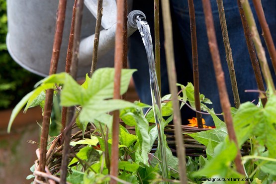 This attractive, dramatic display combines the fiery blooms of two climbers – black eyed Susan and Ipomoea lobata, teamed with complementary plants (we’ve used gazanias) at their base. A rustic looking support, such as this pyramid one made of wicker, gives a natural feel. Tie the climbers to the support to help them on their way.