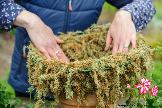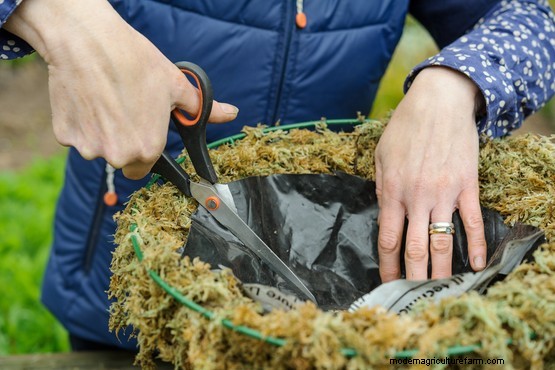 Add a piece of plastic – such as from an old compost bag – to the inside of the moss, to help retain moisture. Cut a few drainage holes in the plastic.