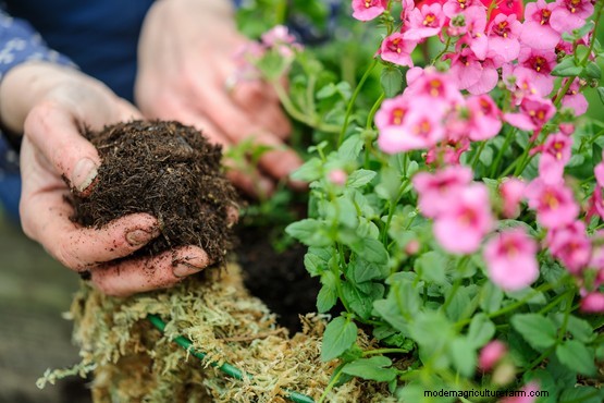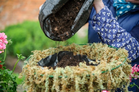 Fill the basket two-thirds with multi-purpose compost, and add water-retaining gel, mixing it in with the compost.