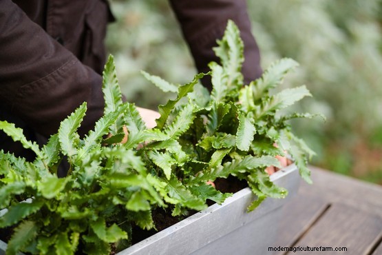 Remove the ferns from their pots and tease out the roots. Position them in the trough, making sure they’re evenly spaced.