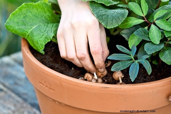 Fill compost in around the plants’ roots, up to the rim of the pot, and firm gently. Plant the bulbs and corms in the gaps.