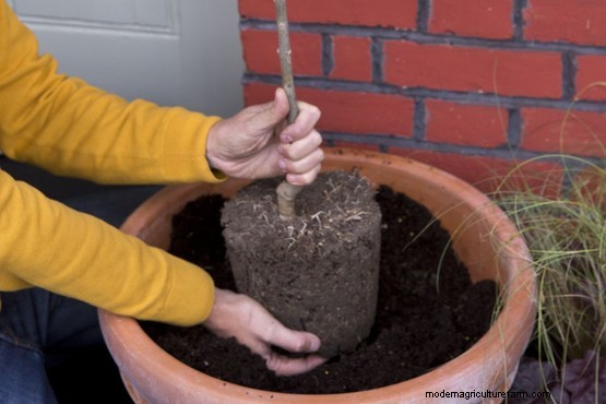 Add crocks to aid drainage and fill the pot two-thirds with compost. Add the olive tree to the centre of the pot, ensuring it’s level and planted at the same depth it was in its original pot.