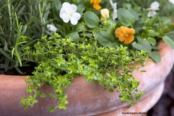 Position the pansy, thyme and other herbs around the olive, letting the thyme spill over the edge. Fill in any gaps with compost and firm down. Water the container thoroughly and allow to drain.