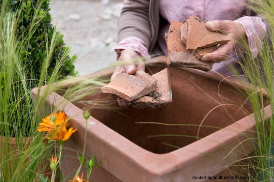 This is a heavy container display, so position your pot in its final position before planting it up. Put a layer of crocks in the bottom of the pot, to aid drainage.