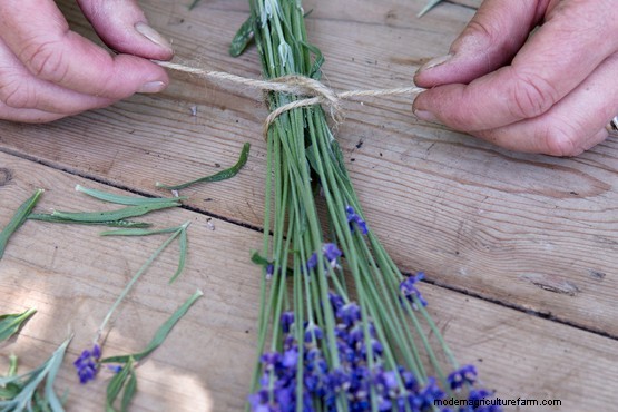 Tie the stems together with soft string or raffia and hang the bunch in a cool, dry place to retain the oils as they dry off.