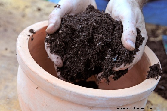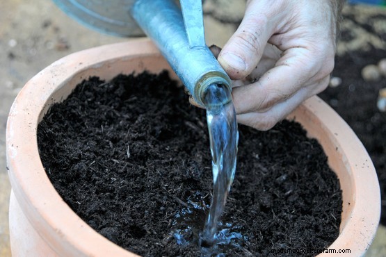 Top up the pot with more compost and lightly firm. The finished surface should be just below the pot rim.