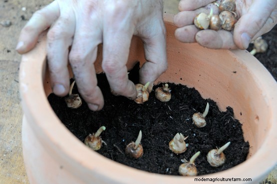 Space out the corms 3-4cm apart, planting right up to the edges of the pot to make full use of the compost surface.